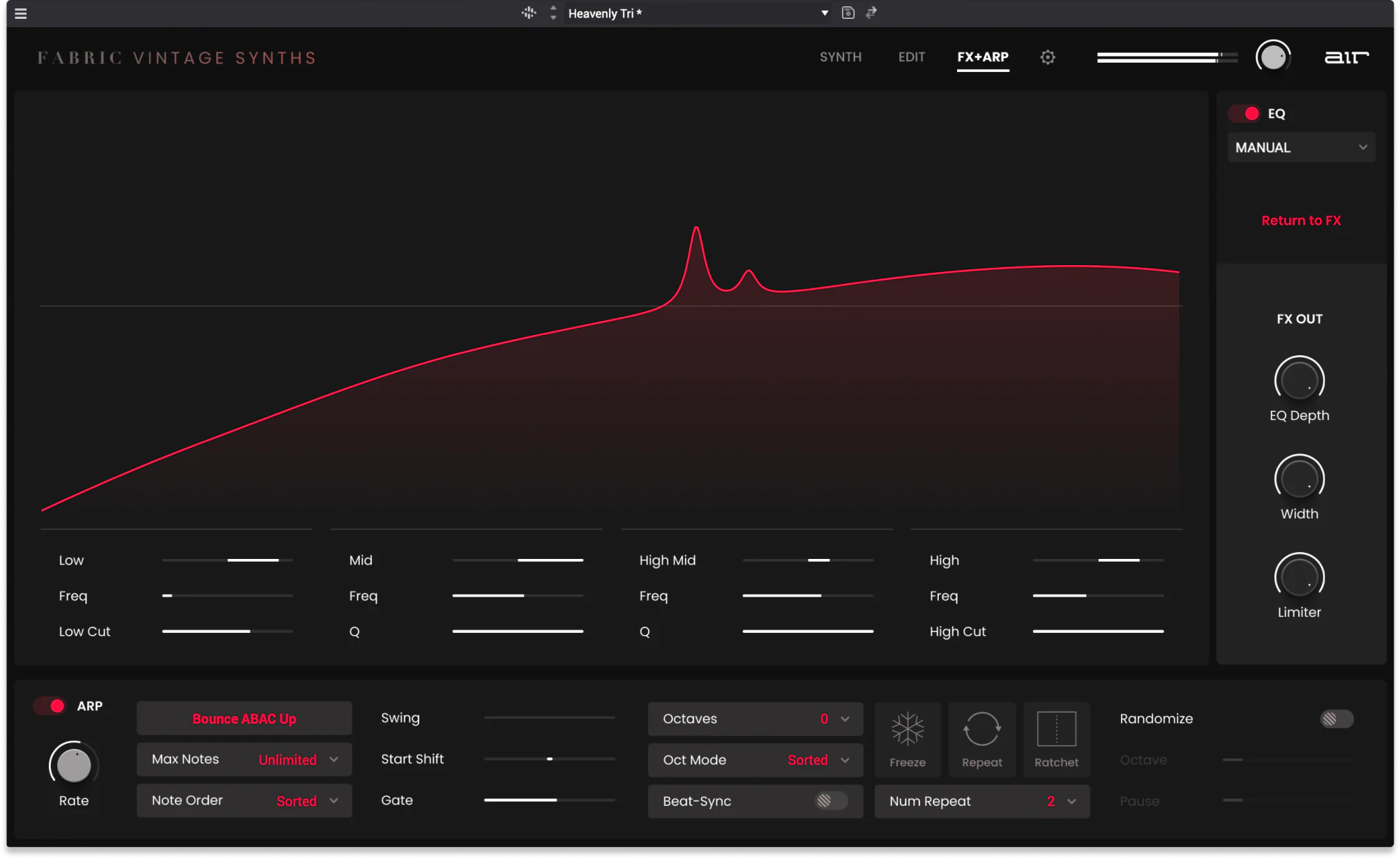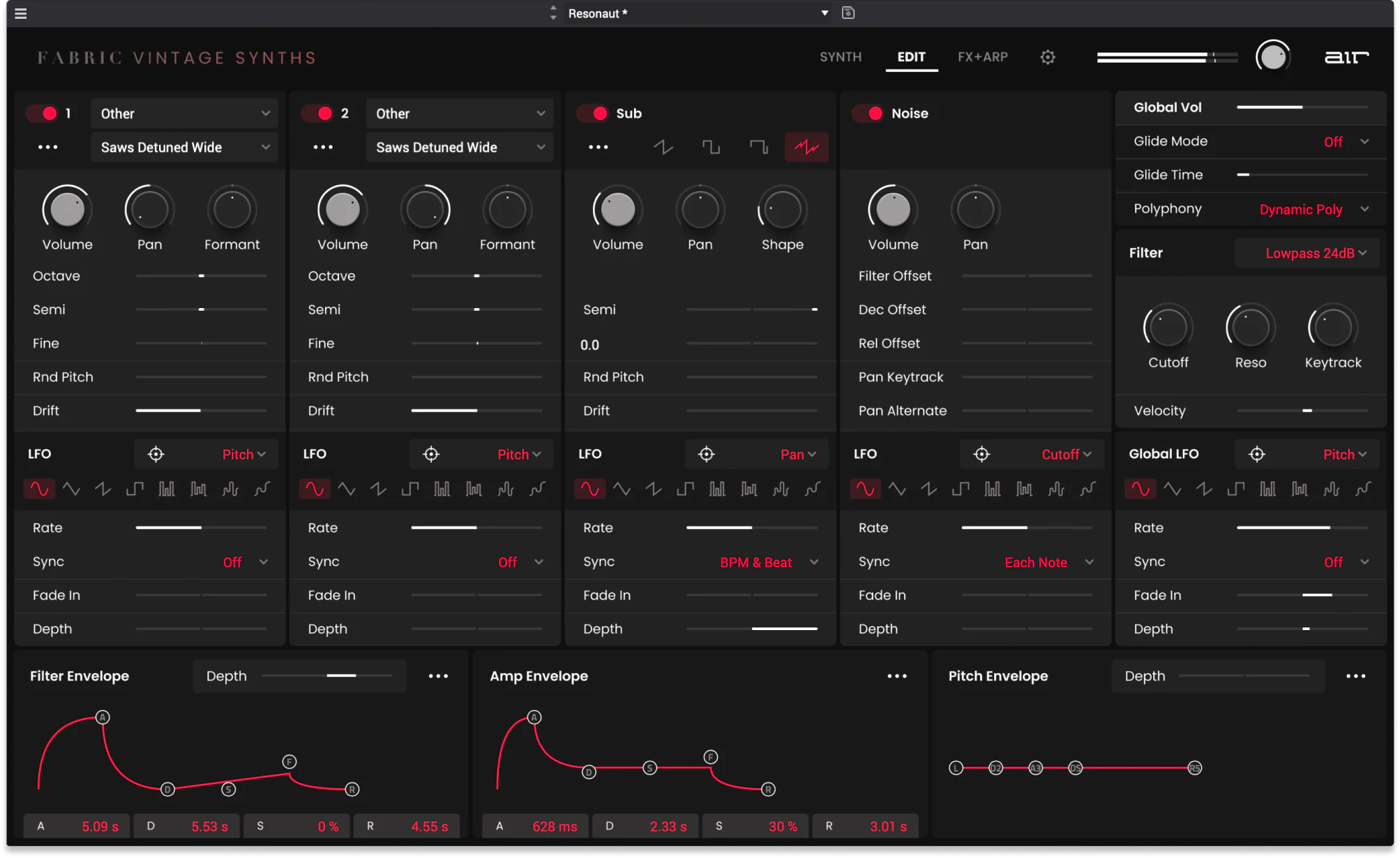 Add body and character to your mixes with Fabric's virtual analog Sub Oscillator offering four selectable wave shapes, volume and pan control, and filter with decay and release offset. It also includes pitch drift, pan key-tracking, and a dedicated BPM-syncable LFO for evolving textures.