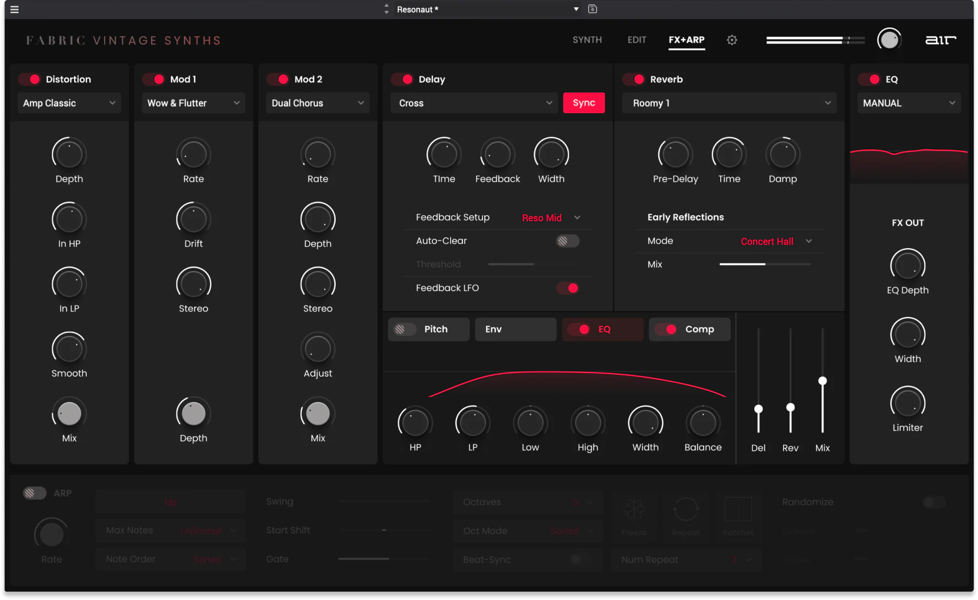 Fabric Vintage Pro has a fixed FX section that includes five modules with mix controls. The distortion section offers 12 models with depth, filtering, smoothing, and two modulation sources. The delay features BPM-syncable modes (single, dual, cross) with extensive feedback options and a feedback LFO. The reverb section includes 12 models, 16 early reflection models, and controls for pre-delay, time, damp, plus EQ and compression.