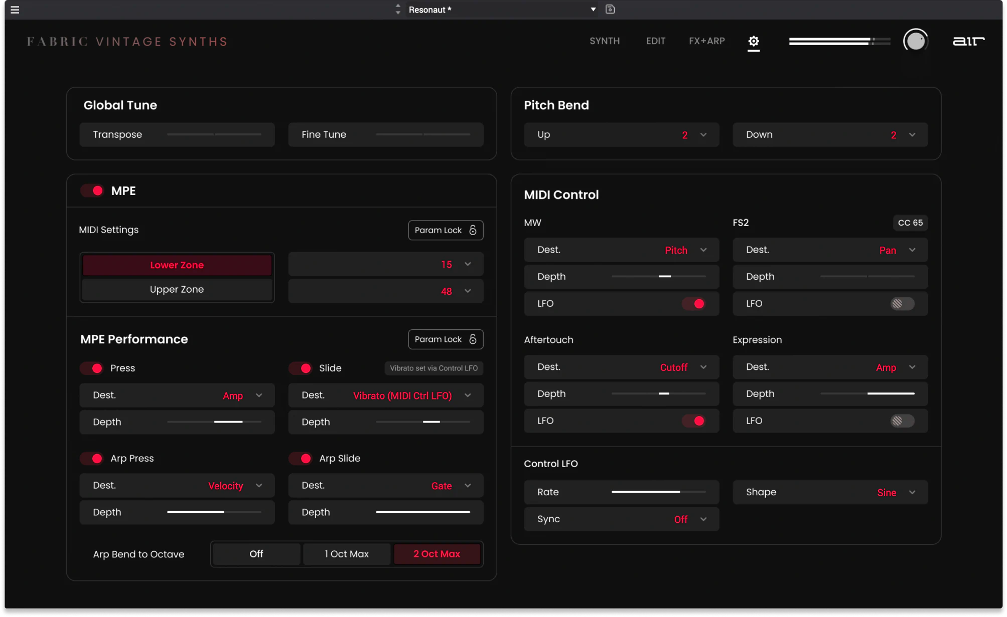Fabric Vintage Pro is MPE compatible. It also is equipped with assignable mod wheel, aftertouch, expression, and footswitch controls that allow for seamless compatibility with MIDI controllers and other external gear.